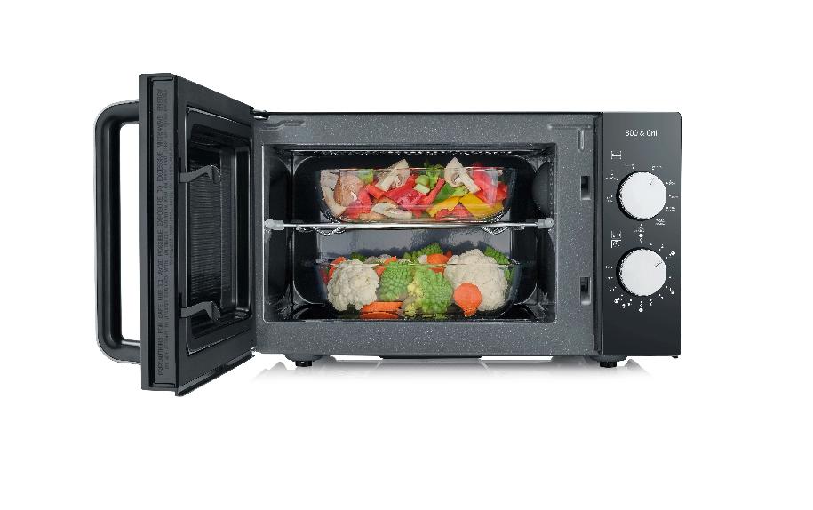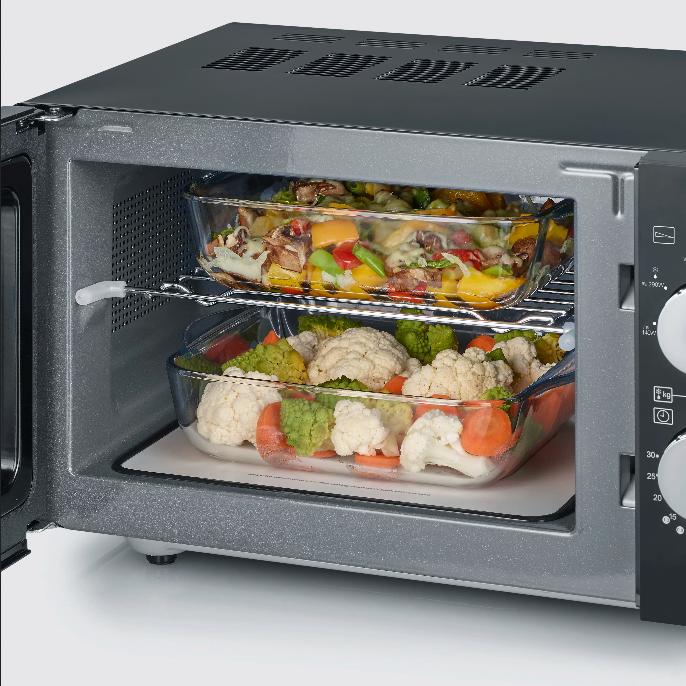 De 2-in-1 magnetron is ideaal voor verwarmen, koken, bakken en grillen zonder draaiplateau. Het grotere bruikbare oppervlak van de magnetron is niet alleen geschikt voor grotere platen, maar ook voor hoekige bakgerechten.